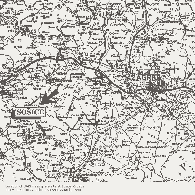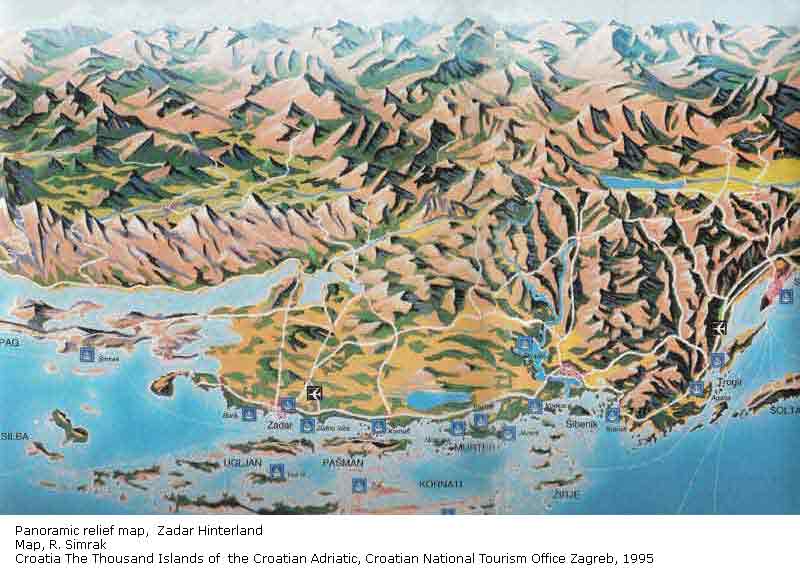 Map 3 ) Banovina of Croatia, as in Royalist Yugoslavia before WWII Croatian Borders 1918—1993, Boban. L., Skolska Knjiga, HAZU,  Zagreb 1993. Map 5 ) Location of 1945 mass grave site at Sosice, Croatia Jazovka, Zanko Z., Solic N.,Vjesnik, Zagreb, 1990 Map 1 ) Panoramic relief map, Zadar HinterlandMap, R. Simrak Croatia The Thousand Islands of  the Croatian Adriatic, Croatian National Tourism Office Zagreb, 1995 Map 11 ) local Zadar map showing most of Policnik Municipality Zemljopisni Atlas Republike Hrvatske, Skolska Knjiga, Leksikografski zavod  Miroslav Krleza, Zagreb 1993